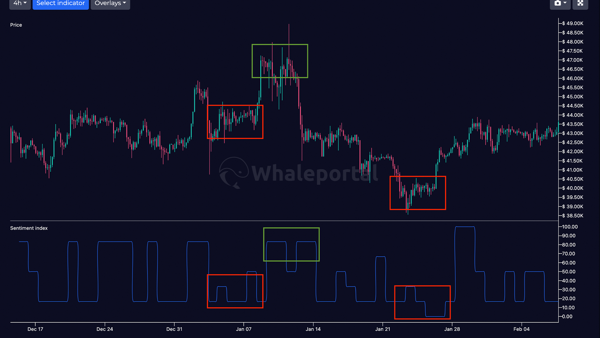 In the example above, you can see clearly, that when the sentiment is bearish or negative (red), the price tends to go up, until the sentiment shifts to a more positive state, where eventually the price comes down again. It may not always be a 100% accurate, but speaking in general terms, when most people are bearish, there is a higher likelihood for the price to go up than when everyone is bullish, and vice versa.